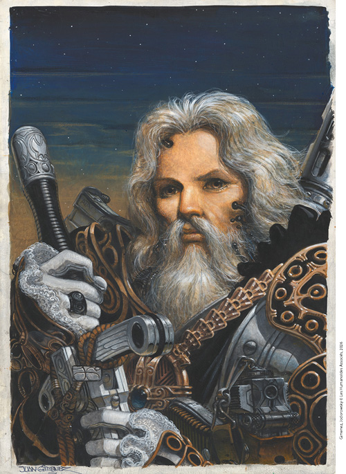 La Caste des Méta-Barons est le plus gros succès de l’Argentin Juan Giménez, décédé en 2020 à l’âge de 76 ans. Il livre ici pour cette couverture une synthèse visuelle magistrale : hyperréalisme des textures, profusion baroque des armures, sophistication des armes et implants cybernétiques. Le visage, archaïque dans sa gravité, mais au regard de séraphin, contraste avec la froideur technologique qui l’entoure, tandis que le fond cosmique inscrit la figure dans une dimension épique. L’art fantastique est ici à son sommet.