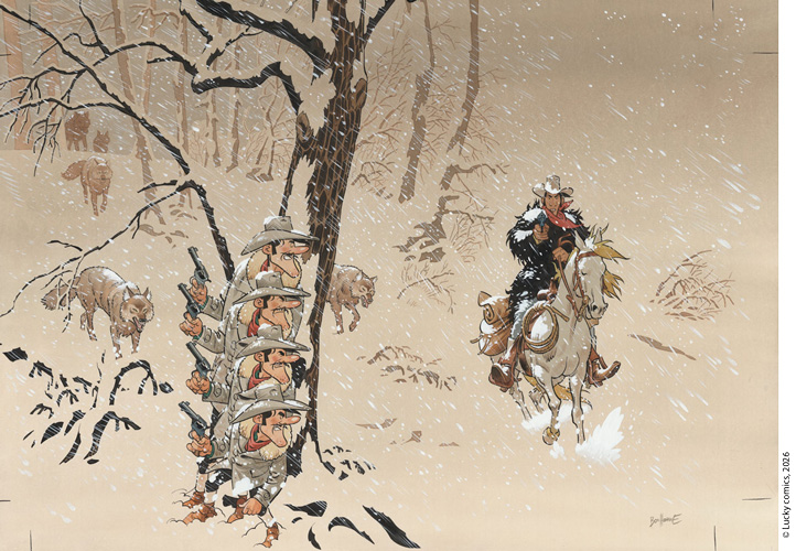 La Longue Marche de Lucky Luke, la couverture originale, des illustrations en couleurs directes, des planches en noir et blanc et une série d’œuvres de